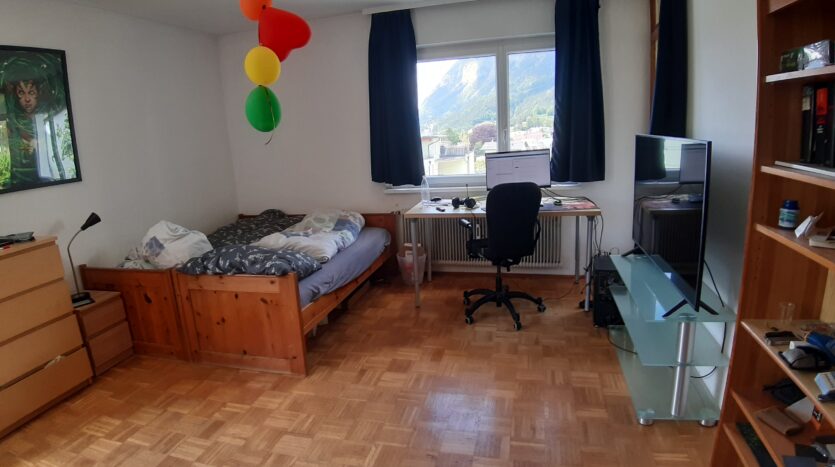 Vermietet wird eine 4-Zimmer-Wohnung (WG geeignet für 3 Bewohner) in Innsbruck Stadtteil Hötting Allerheiligen im Grauen Stein Weg 39 im 2. Stock. 2 kleinere Zimmer nach Osten, 1 großes Zimmer nach Süd-Westen mit Balkonzugang, 1 separate Küche mit Balkonzugang, 1 Badezimmer mit WC und Badewanne, 1 Abstellraum, großer Vorraum. In der Küche befindet sich eine Einbauküche, in den 3 Zimmern ist ein Parkettboden, alle Zimmer sind unmöbliert, im Vorraum und in der Küche ein Fliesenboden, der kleine Balkon ist überdacht und zeigt nach Süden, freie Sicht in die Bergwelt, Waschraum und Gemeinschaftsraum im Keller, großer Gemeinschaftsgarten, 1 nicht der Wohnung zugewiesene Autoabstellmöglichkeit, kein eigenes Kellerabteil vorhanden. Beziehbar ab 1.6. bzw. 1.7.2023.