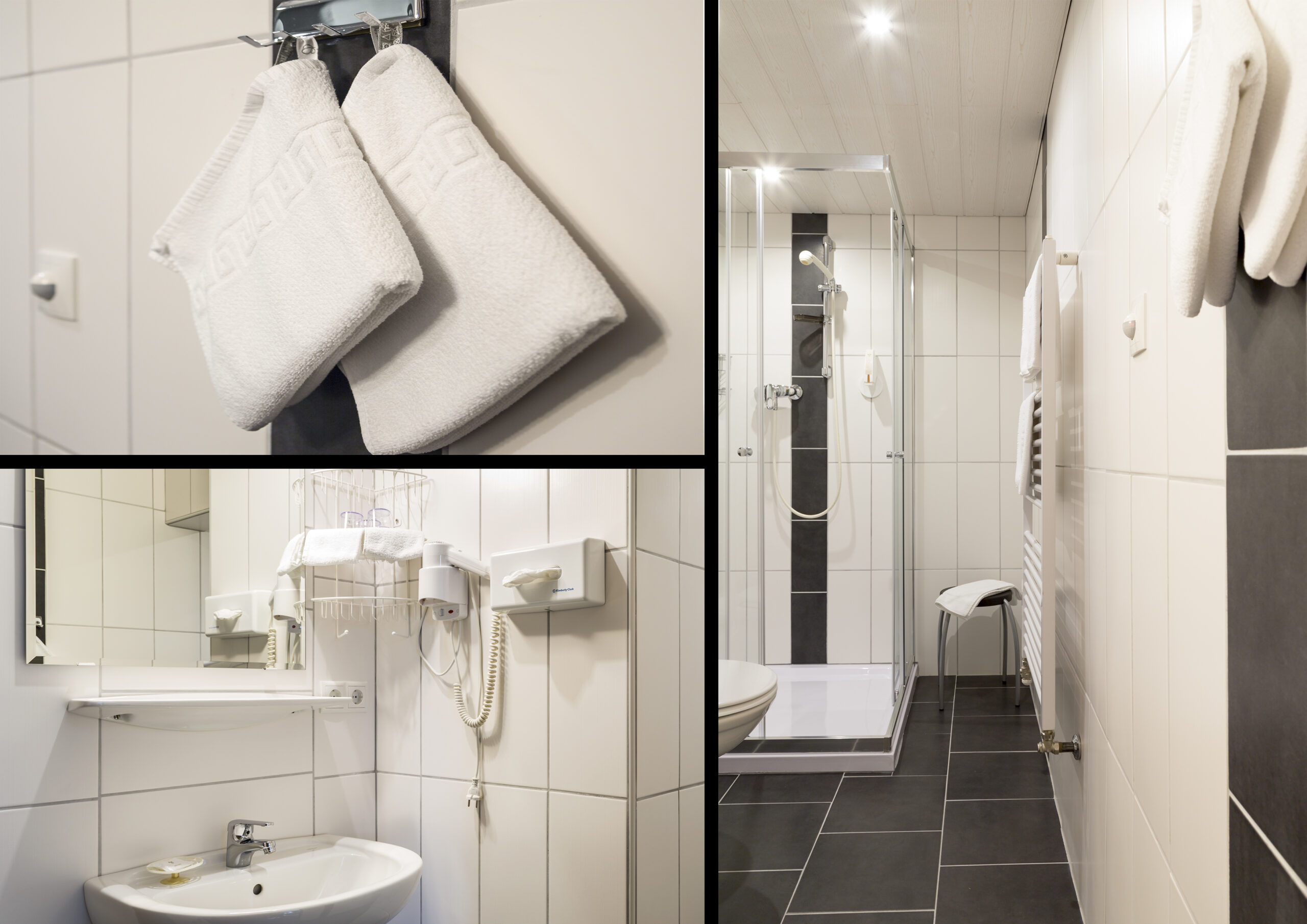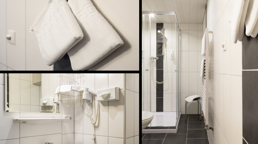 Mobiliar-Bad: Dusche mit Duschwand, Brausearmatur, Seifenhalterung, WC mit WC-Deckel, WC-Papierhalter, Waschbecken mit Armatur, Spiegel inkl. Beleuchtung, Föhn, Deckenbeleuchtung, Kosmetikkorb, Hocker