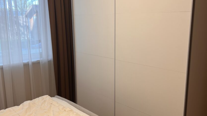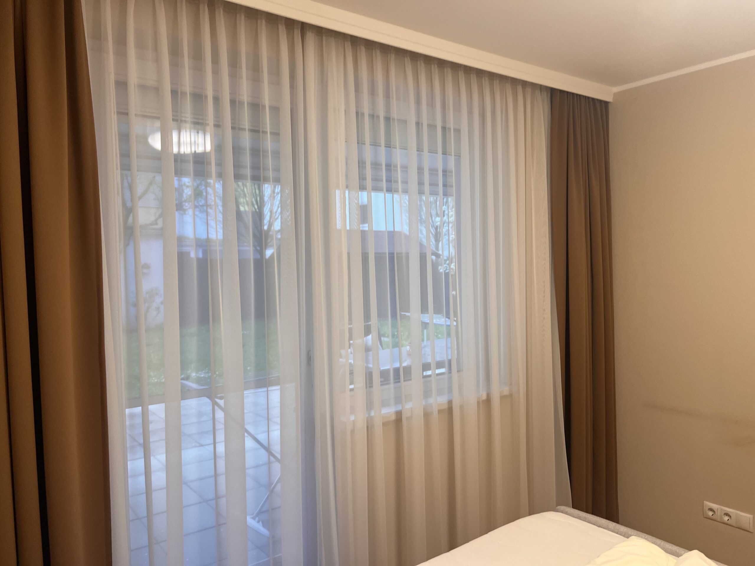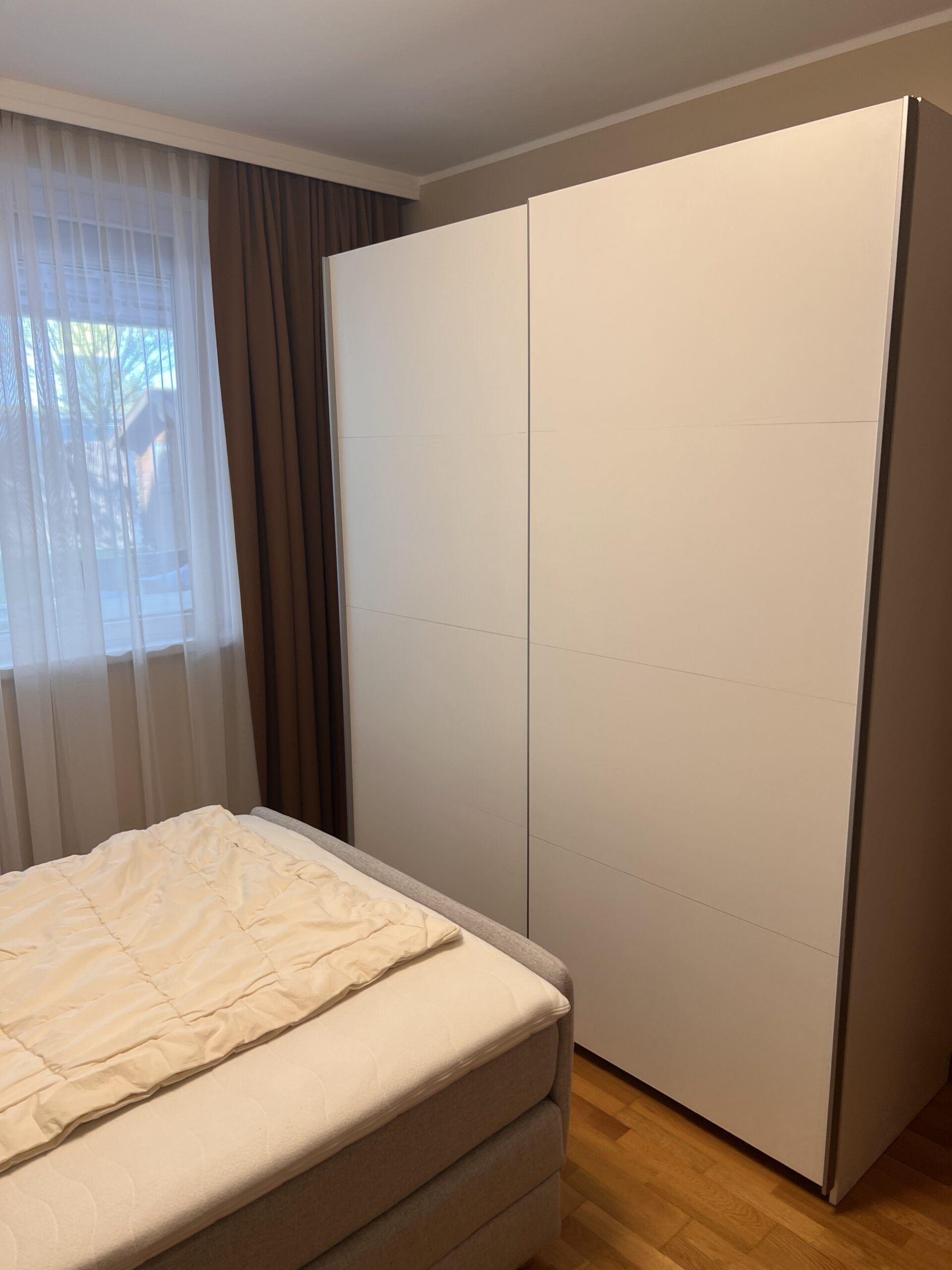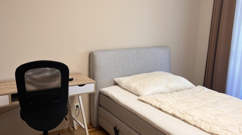 Das Zimmer ist vollmöbliert mit ADA Boxspringbett, Schrank, Fußbodenheizung, Plissee und Jalousien.