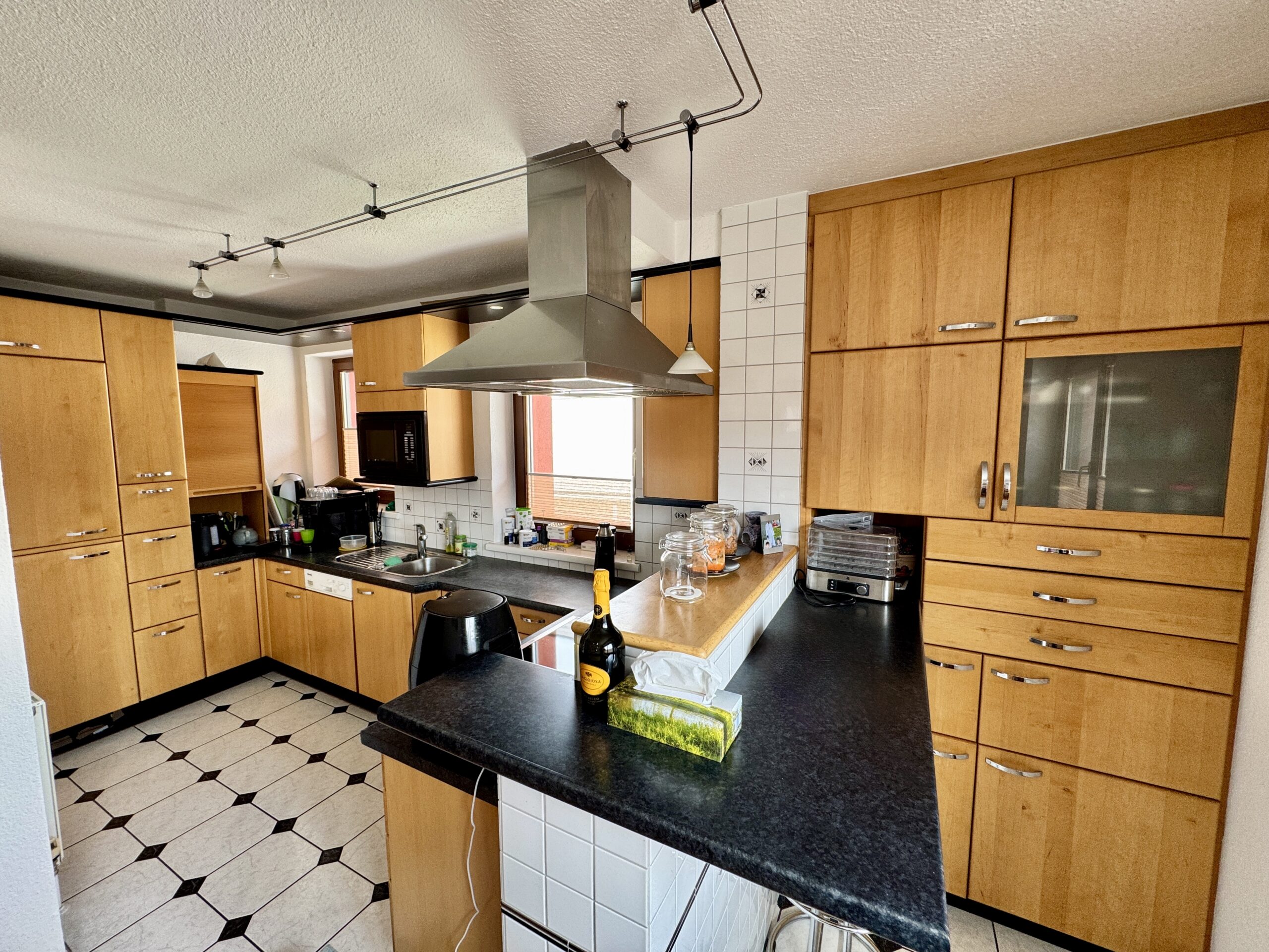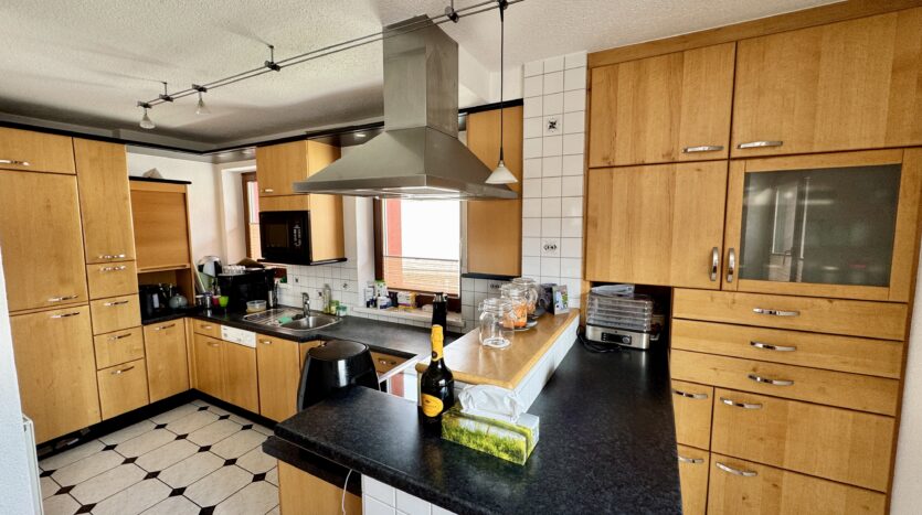 Die Wohnung ist ca. 135 m², mit Balkon, Terrasse, kleinem Garten mit Laube und sogar einer Sauna im Keller. Außerdem gibt’s einen kleinen Fitnessraum – nichts High-End, aber reicht für Basics 💪