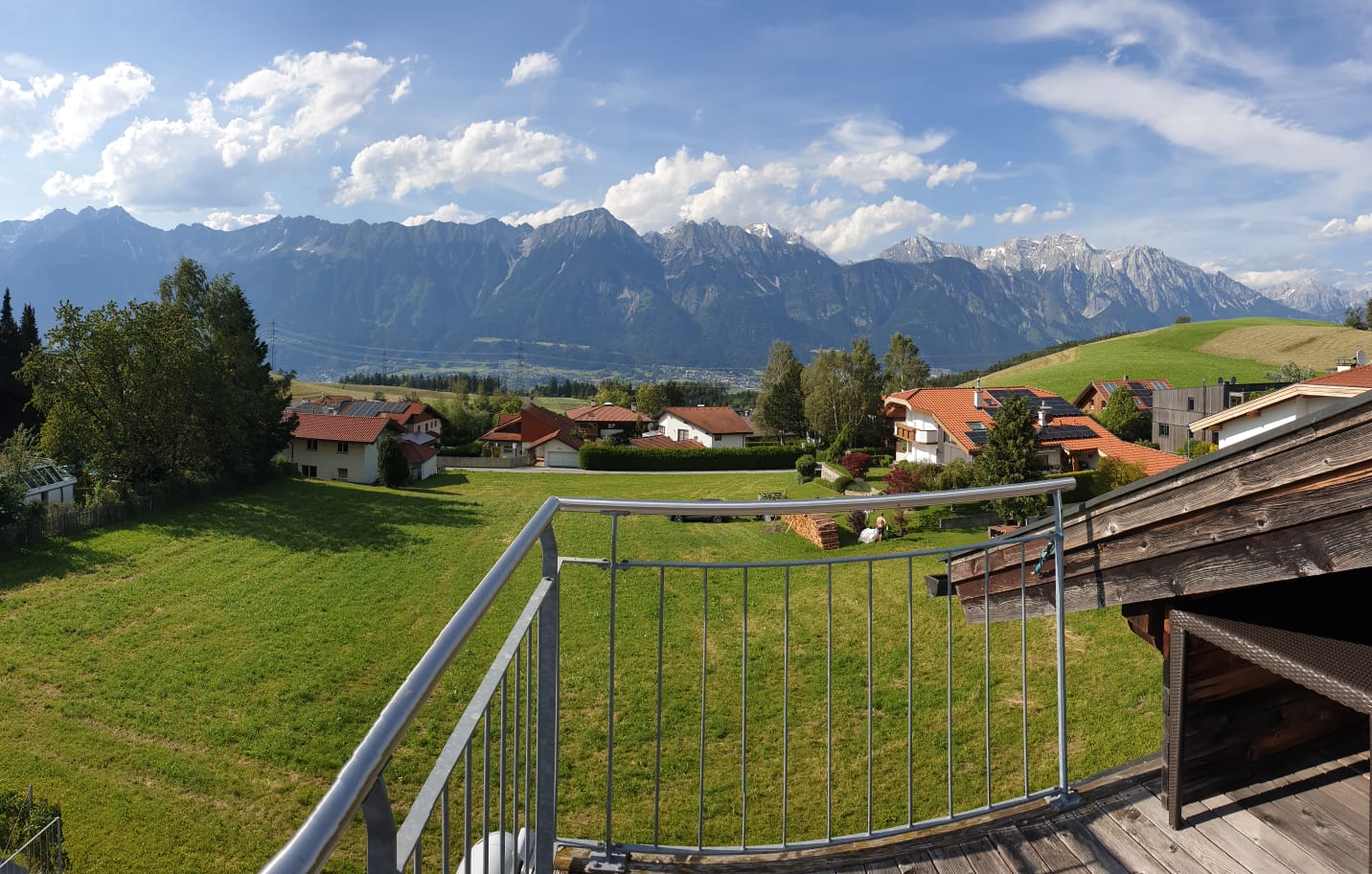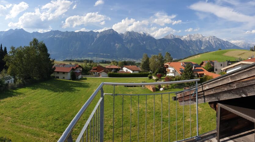 Die halb überdachte Dachterrasse ist nach Süd-West-Nord ausgerichtet und bietet einen fantastischen Blick über das ganze Inntal und deren Bergketten. Sie ist im Sommer wie ein weiterer Gemeinschafts-Wohnraum mit Naherholung.