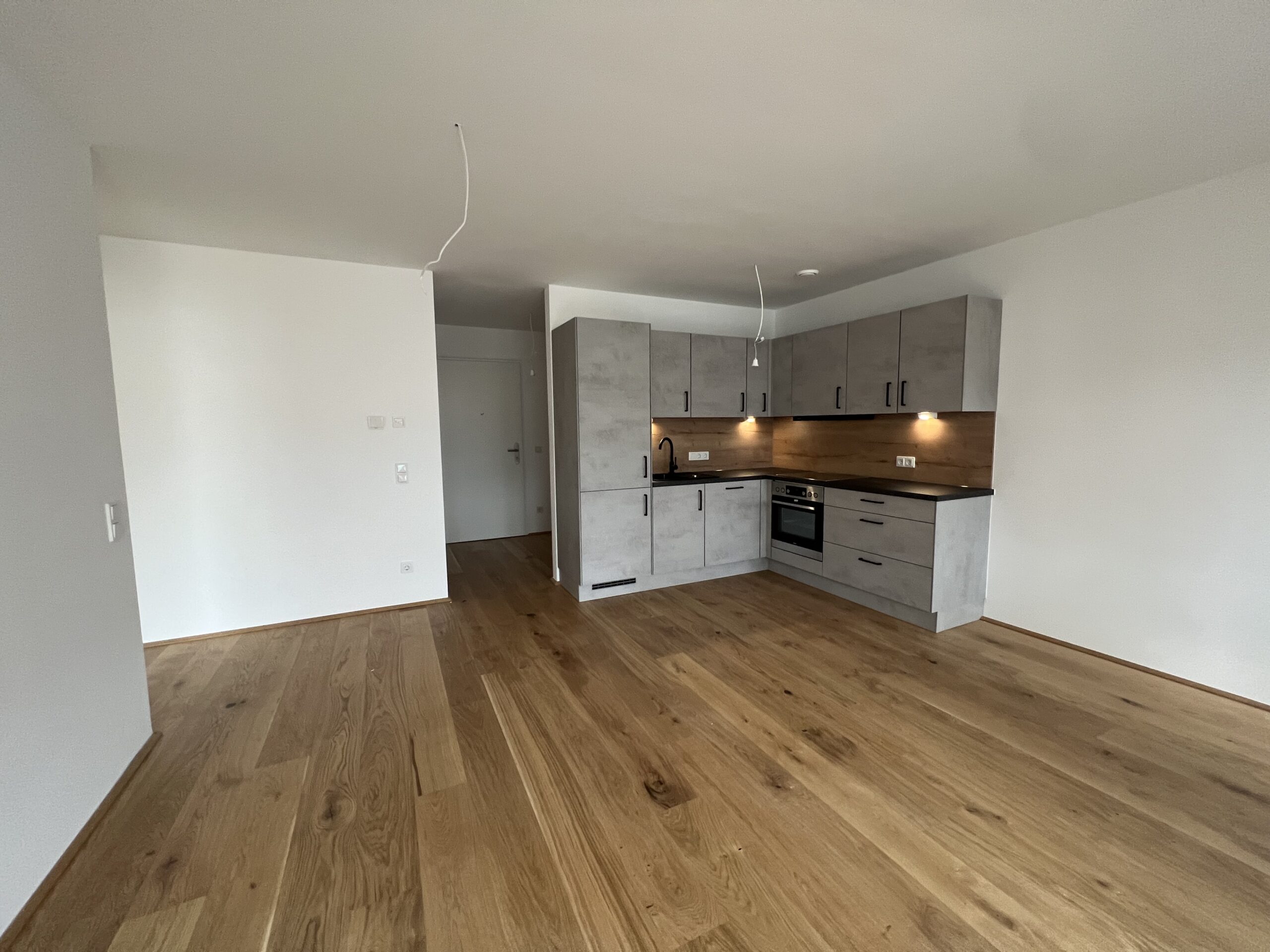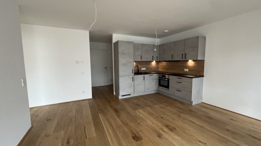 Die 74m2 Wohnung bietet einen Wohn- / Essbereich mit voll ausgestatteter Einbauküche (inkl. Spülmaschine, usw.) und Oberlichte und einem separaten Schlafzimmer.