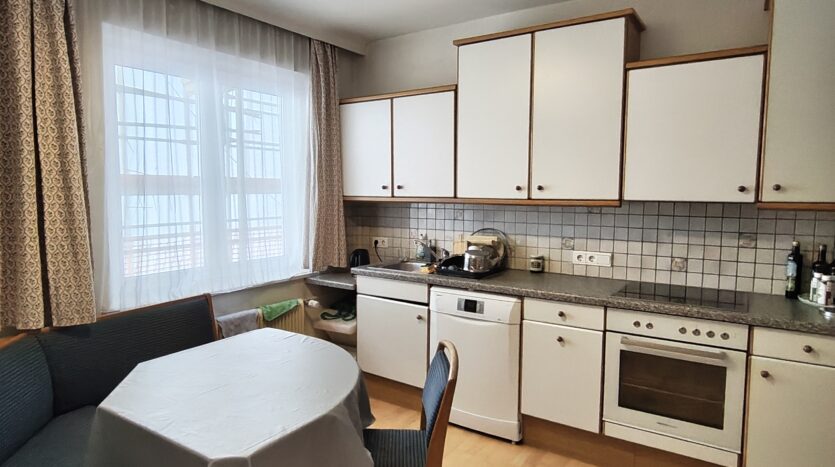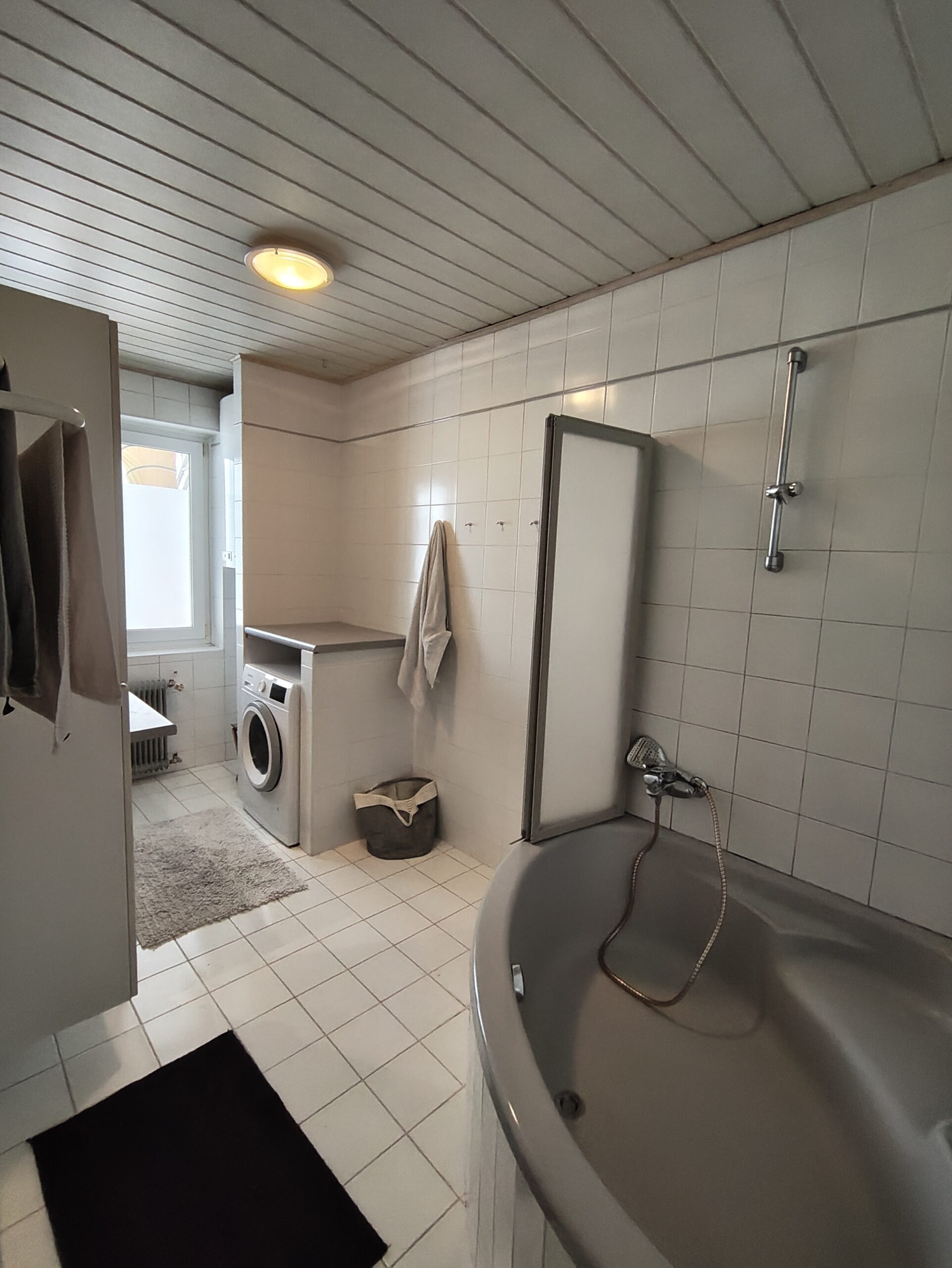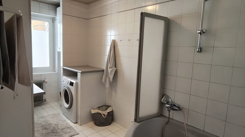 Zur gemeinsamen Nutzung stehen eine funktionale Küche, ein geräumiges Wohnzimmer, ein Balkon, ein großer Gang, ein großes Bad sowie zwei WCs zur Verfügung. Zusätzlich gehören ein Kellerabteil und eine kleine Garage als Stauraum zur Wohnung.