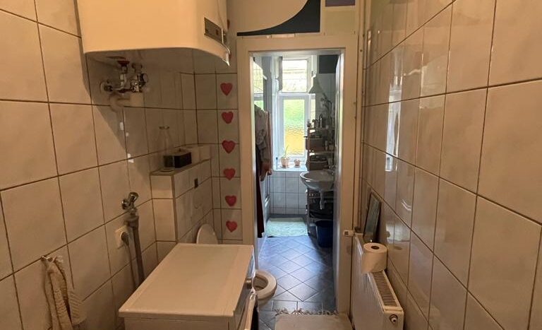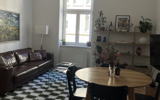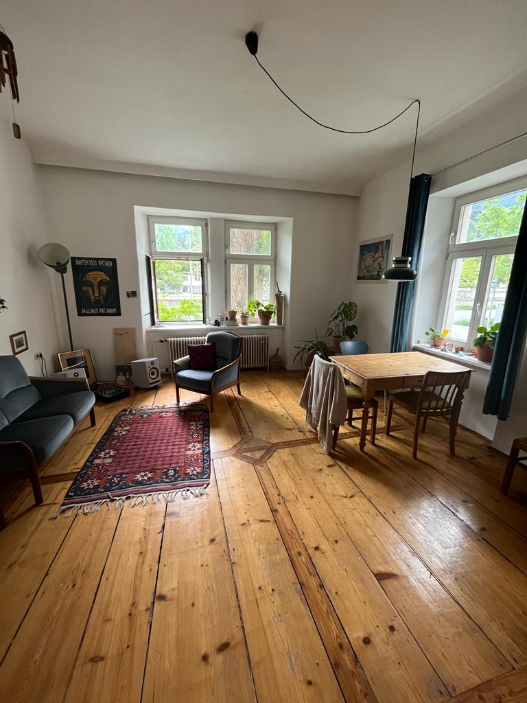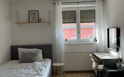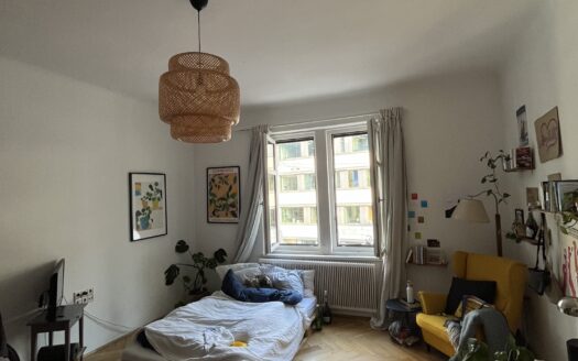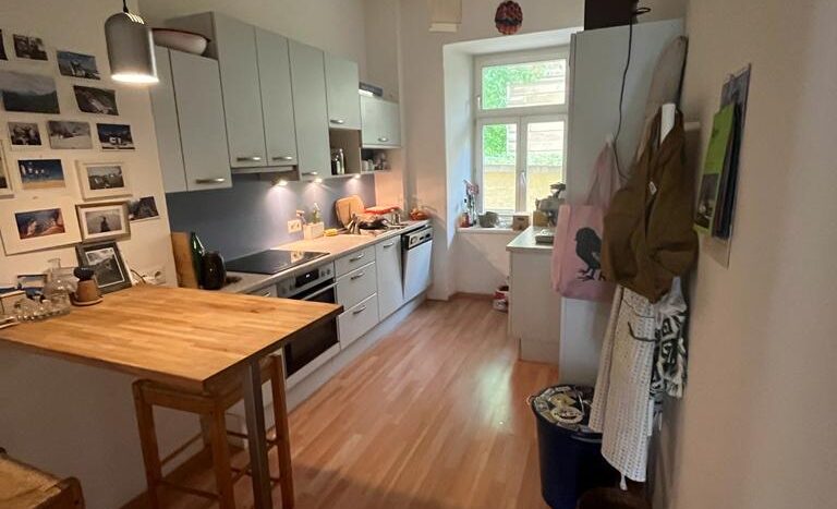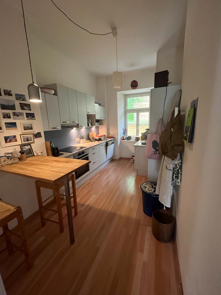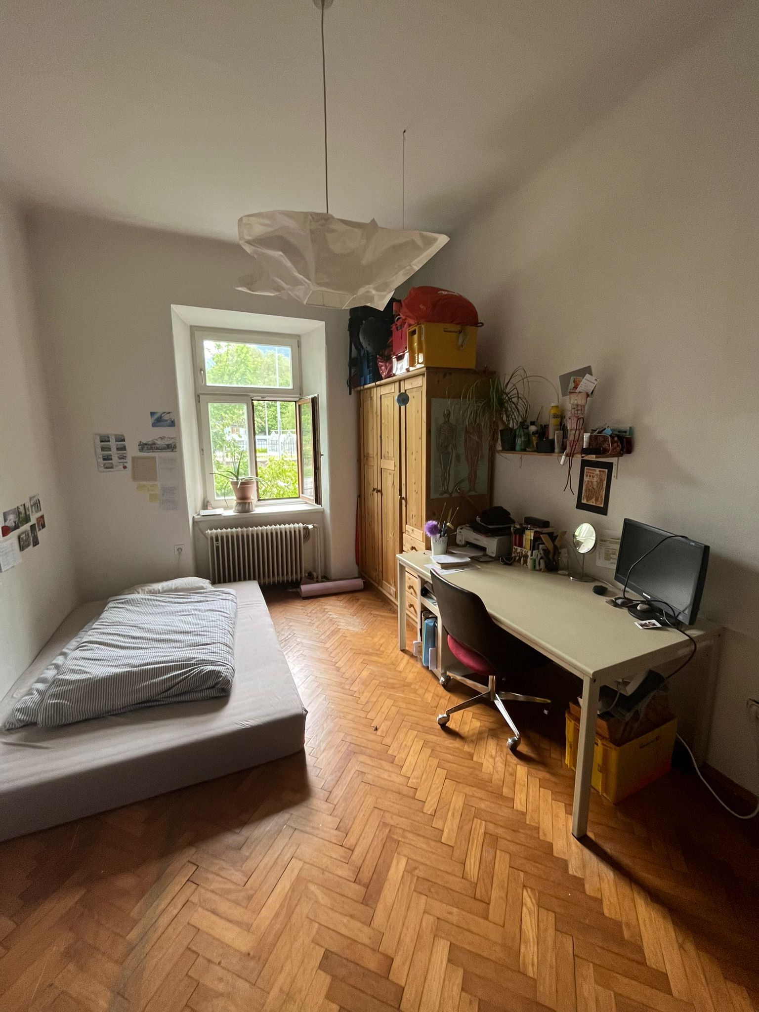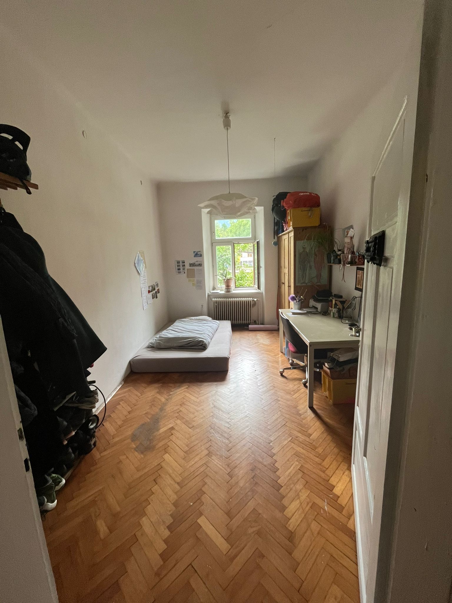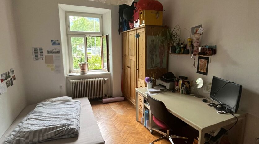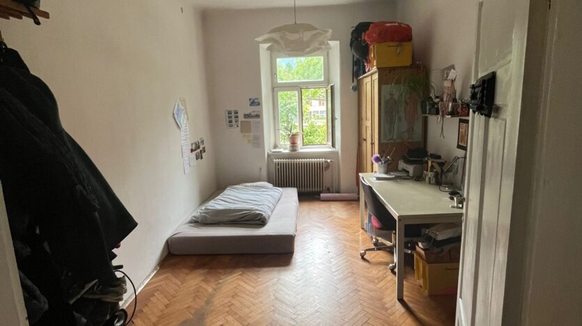 The room is 16.2 m², faces west and has a beautiful parquet floor. We also have a large living room and a small fine kitchen. The room is rented furnished (bed, desk, wardrobe) with a 140×200 mattress. All in all, the room costs 600 €/month + key deposit 400 €.